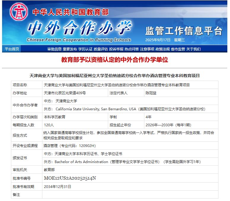 近日,伟德国际1946与美国加利福尼亚州立大学圣伯纳迪诺分校合作举办酒店管理专业本科教育项目获教育部批准设立。这是我校国际化办学中的又一标志性成果,为我校切实推进高水平教育开放,引进境外优质的办学理念、教学方法和管理经验,促进我校教育教学质量和管理水平的提升,强化我校的办学特色和专业优势搭建了新的平台。